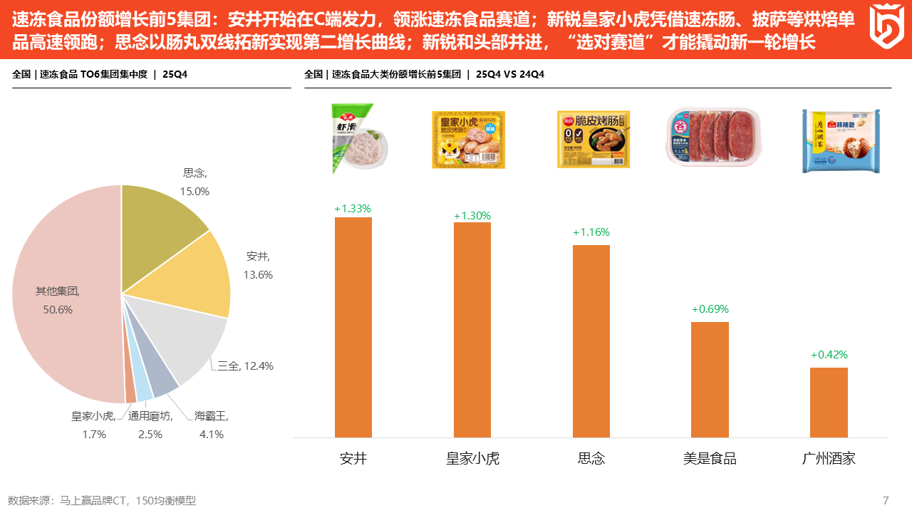 2025Q4,速冻食品市场份额同比增长前五的集团分别为安井、皇家小虎、思念、美是食品和广州酒家,其中有传统品类的头部,也有新兴集团。下面对驱动他们增长的品类进一步分析:安井去年通过在C端火锅丸料、速冻肠的发力,推动了集团市场份额的进一步增长;新锐黑马皇家小虎,则在烤肠、披萨和蛋挞等速冻食品的新兴品类中增长非常亮眼;老牌集团思念从去年开始在速冻肠赛道发力,其创意汤圆也在传统类目中收获了新的增长,最终实现市场份额的进一步提升;而做速冻调理牛肉的美是食品,正是速冻牛排系列产品增长的非常好;广州酒家则基于餐饮渠道的美誉度与品牌力,在速冻食品尤其是速冻面点类目中成长显著,迅速打开局面。
