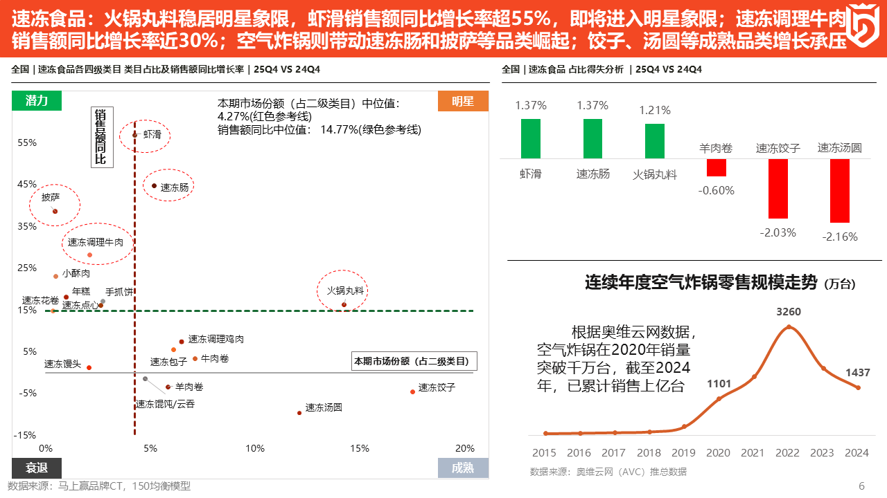 另外,我们也发现,速冻食品大类中各品类的增长、下滑,其实与消费者对于速冻食品的烹饪方式、烹饪工具上的改变有着非常强的关联。右下角是空气炸锅在2015年-2024年的零售规模走势,其在2020年以后开始爆发增长,到2024年,空气炸锅的销量已经累计超过1亿台了。我们全国总共大概4亿个家庭,将近1亿台的空气炸锅保有量,可见这种新型家庭烹饪工具的普及率,这也为品类结构的变化提供了一些依据与支撑,包括刚才提到的速冻肠、披萨、速冻调理牛肉、小酥肉等品类,都与空气炸锅的普及有很强的相关性。