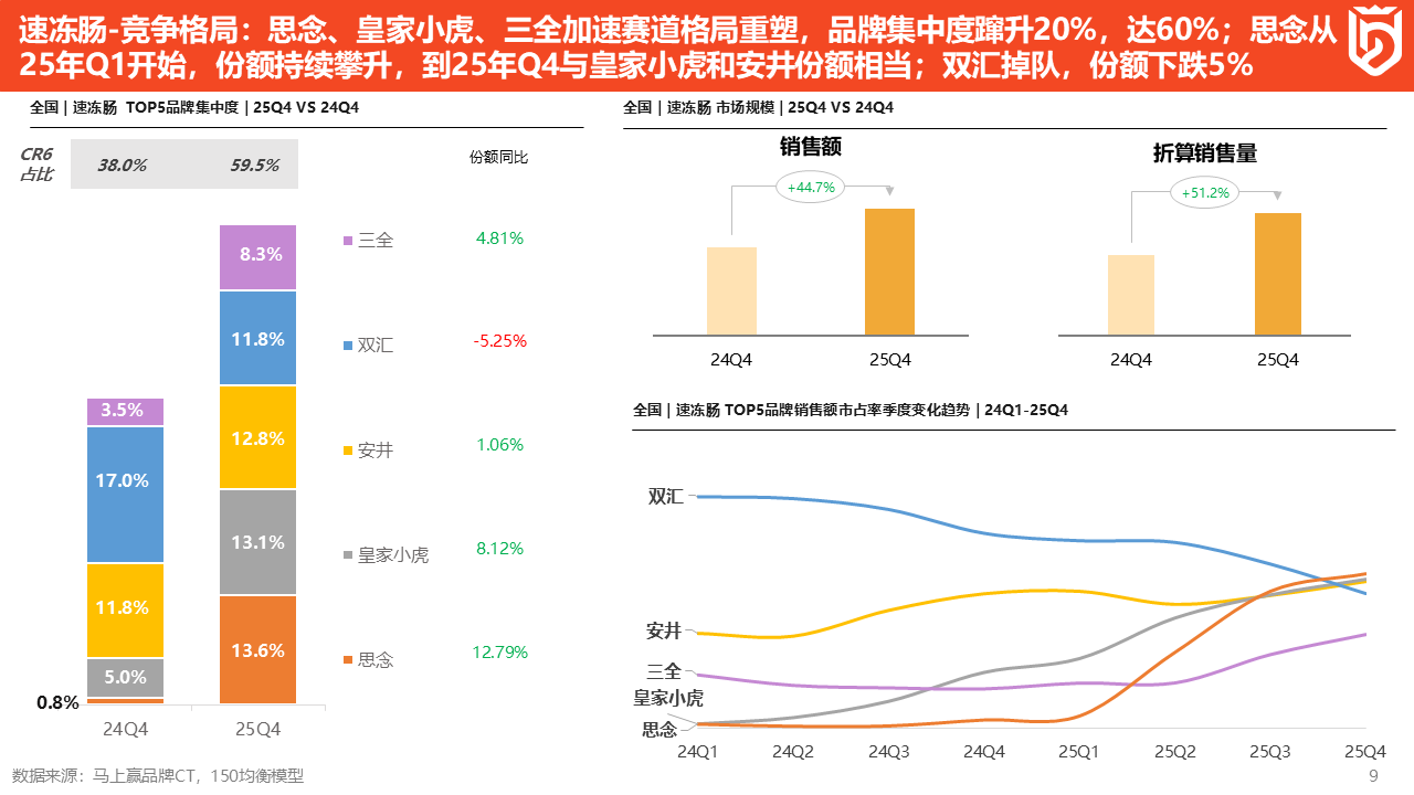 速冻肠类目发展非常快速,从右上角的市场规模来看,整个速冻肠类目的销售额和销售量在2025Q4分别同比增长了44%和50%,增长非常显著。