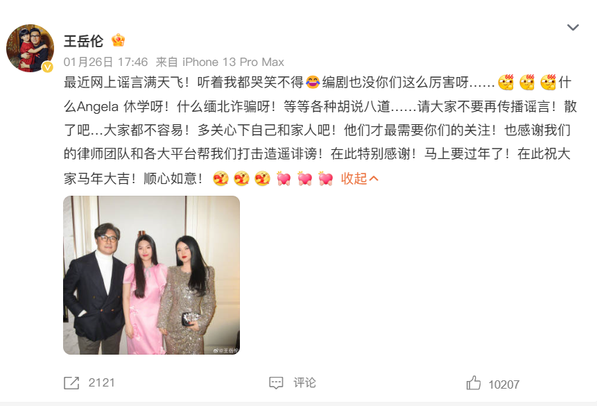 王岳伦的发文很直接,就是两个字:辟谣。他晒出了一张过去一家三口的合照,照片里李湘和女儿王诗龄笑得很开心。他主要澄清了两件离谱的事:
