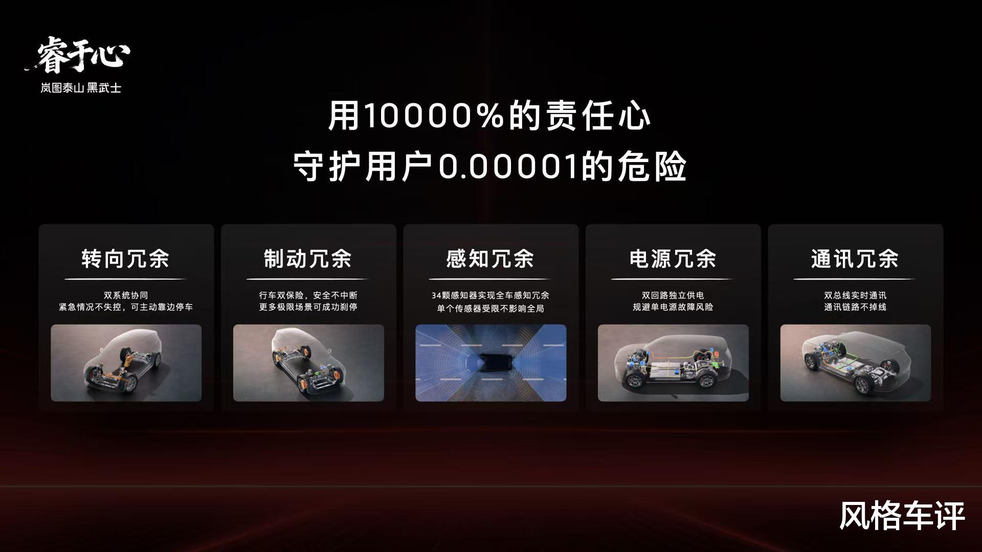 岚图泰山Ultra版基于全球首个具备L3技术能力的天元智能架构开发,深度融合岚图自主开发的青云行驶平台,采用行业顶级的五大安全冗余设计,涵盖转向、制动、感知、通讯、电源五大核心维度,通过多重备份机制彻底消除故障风险,满足L3有条件自动驾驶的安全要求,为用户出行筑牢双重保障。在央视直播测试中可以看到,岚图泰山Ultra版遇到驾驶者失能、前车掉落障碍物、异物遮挡视线等危机场景,能在第一时间做出最正确的驾驶决策,避免事故发生。在悬空、极窄或有异形障碍物的车位中泊车,岚图泰山Ultra能精准识别周围环境,高效安全完成自动泊车。