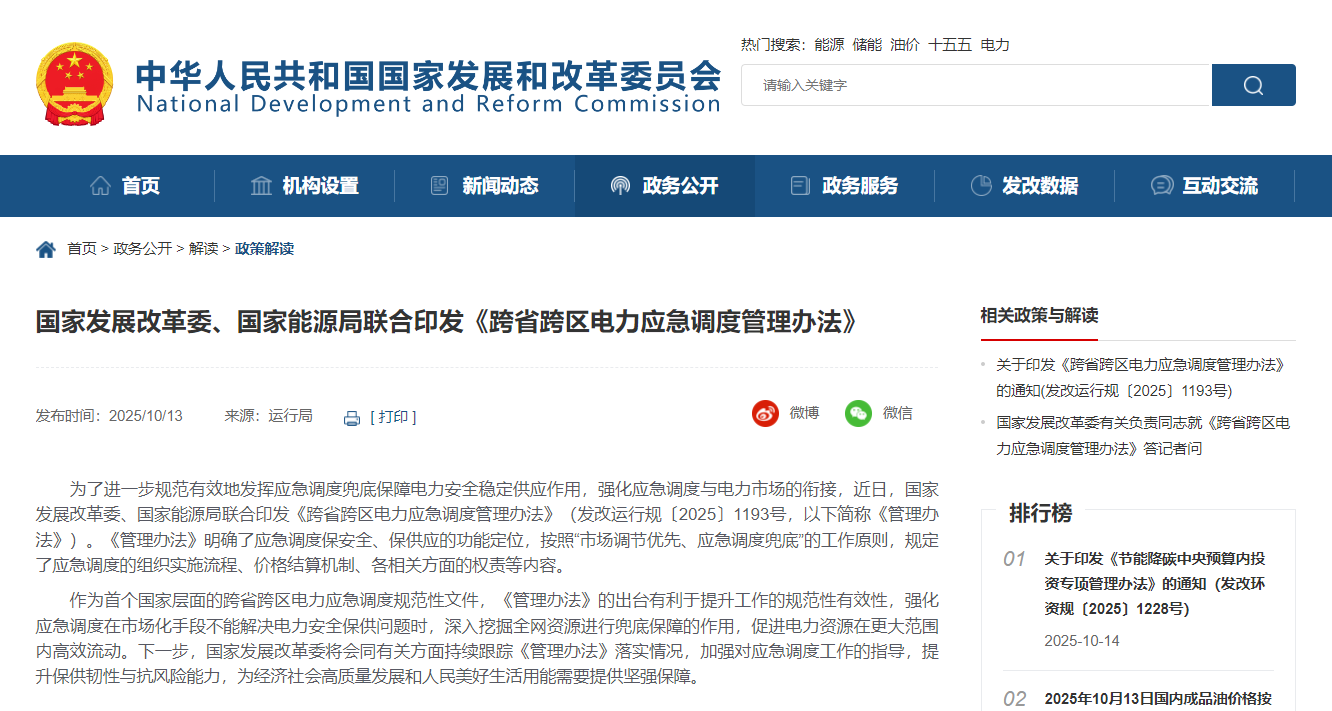 《跨省跨区电力应急调度管理办法》已于2025年10月1日正式实施,有效期5年。这份国家层面的首个应急调度文件,标志着我国电力系统正式确立“市场调节优先、应急调度兜底”的新模式,为构建全国电力“安全网”提供了关键性的制度支撑。
