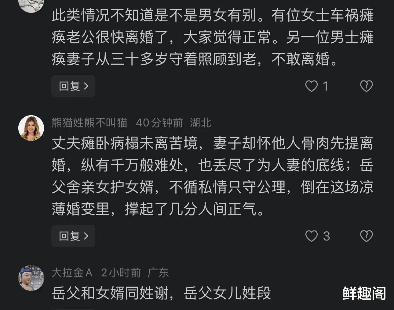 当地法院也表示,这件事情比较复杂,目前还在调查中。针对此事,许多网友也是纷纷展开热议,一位网友说,父女俩一起坑这个男的,吃干抹净就闪人;还有网友说,这种情况,丈夫瘫痪,妻子在法律上是不能离婚的。