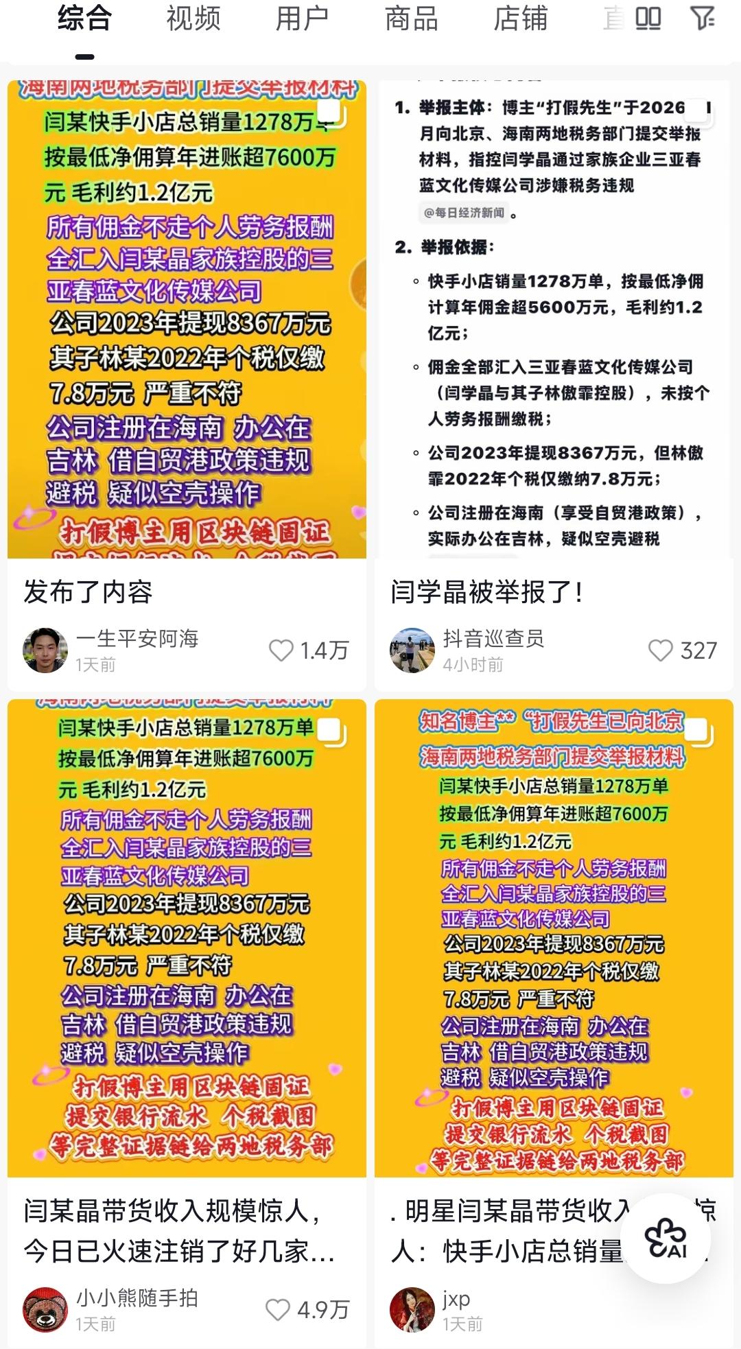 对此,有打假网友接连发布了多条视频,质疑闫学晶儿子税务问题,并且相关资料已经在网上固定,随时都可以交给有关部门审查。