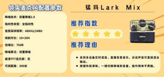 猛玛Lark Mix主打超薄纽扣式设计,单个重量仅9.4g,可灵活固定在衣领、帽檐等位置,佩戴舒适无坠感且隐蔽不抢镜。搭载48kHz/24bit高采样率,1–2米内可精准捕捉声源,人声收音清晰度高。降噪能力出色,能有效抑制环境噪音,还原自然纯净的录音质感。支持双麦收音,完美适配双人对话场景;总续航24小时满足全天创作,充电仓自带转轴设计,便携易收纳。兼容手机与相机多设备,操作简单易上手,是注重外观设计与便携性创作者的优质之选。