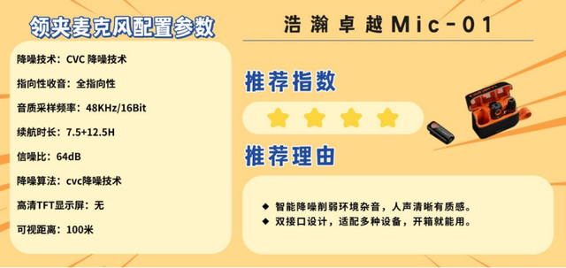 浩瀚卓越Mic-01核心优势是稳定收音,专为外景Vlogger、运动记录者等对传输稳定性有高要求的用户打造。搭载先进无线传输技术,实现100米无遮挡稳定传输,延迟低至20ms,即使在运动场景下也能保障收音无断连。内置全指向咪头,搭载48kHz/24bit高规格采样率,人声清晰自然,细节丰富;基础降噪功能可有效过滤户外轻度风噪。总续航24小时,搭配磁吸充电仓,便携性出色。即插即用设计兼容手机与相机,配件含防风毛套,操作简单,是传输稳定型收音设备的优选。