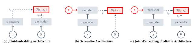 图25:自监督学习架构采用不同方法建模输入兼容性:(a) 联合嵌入对齐兼容输入的嵌入;(b) 生成式方法通过潜变量条件解码器重构信号;(c) 联合嵌入预测使用潜变量条件预测器预测嵌入。各框架优化能量分配——兼容输入能量低,不兼容输入能量高 [431]。
