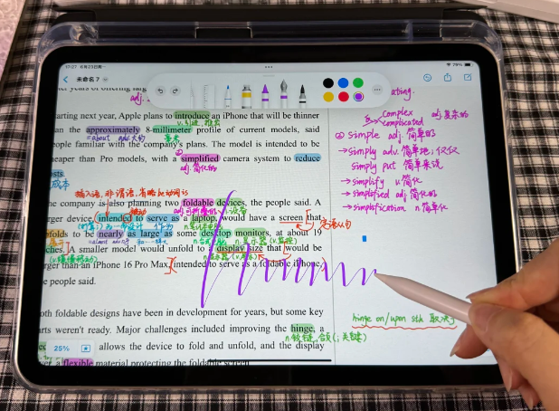 书写表现上,西圣 Pencil X把重点放在实际书写体验,而非外观或附加噱头。日常做笔记、标注或绘图时,线条输出稳定,跟手性高,延迟低。它采用0.1mm超细压感触点技术,边缘细节识别更精确,能有效减少跳线或断触。结合新一代 AI 触控芯片,响应速度显著提升,书写和绘画过程中几乎无拖影。并且它的笔尖使用与原装同规格的POM材质,阻尼适中、书写顺畅,并支持精确倾斜识别,线条粗细可随角度变化自然。