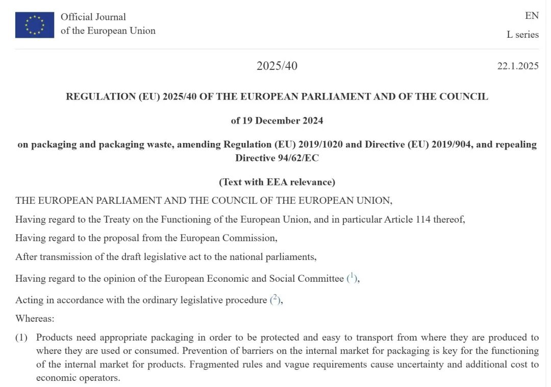 2025年1月22日,欧盟正式发布《包装和包装废弃物条例》(EU 2025/40,简称 PPWR)。
