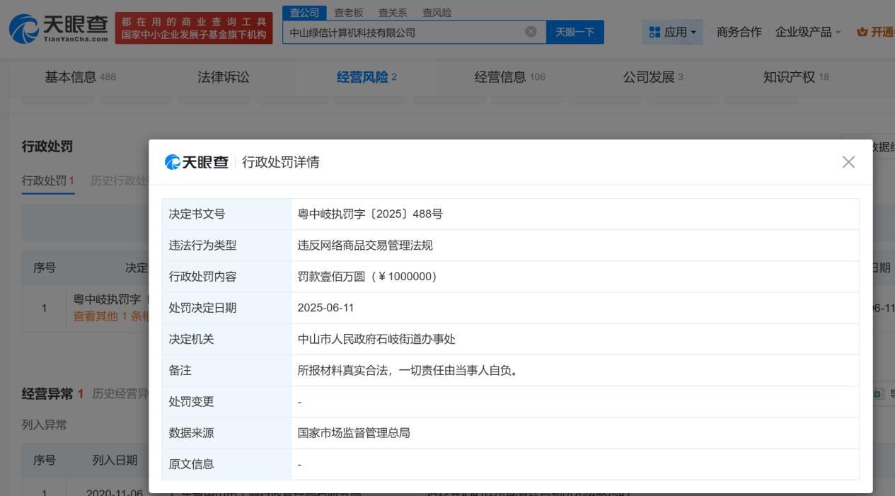 天眼查经营风险信息显示,该企业还因“生产经营的食品标签、说明书含有虚假内容,涉及疾病预防、治疗功能,或者生产经营保健食品之外的食品的标签、说明书声称具有保健功能”,于去年4月17日被遂溪县市场监督管理局列入严重违法失信企业名单。