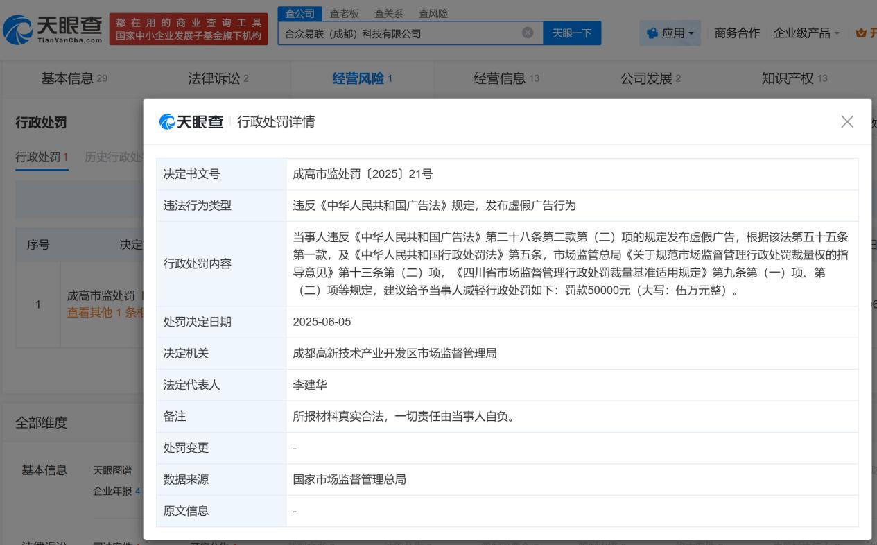 而另一家“合众易联(成都)科技有限公司”则因“违反《中华人民共和国广告法》规定,发布虚假广告行为”,被成都市高新技术产业开发区市场监督管理局处以5万元罚款。