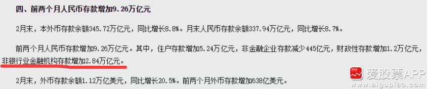 咱们股民最关心的一个指标:非银金融机构存款!这个大家都懂,就是存款进入股市的钱。前两个月增加了2.84万亿,去年同期增加1.72万亿元。也就是说,比去年同期多了1.12万亿!