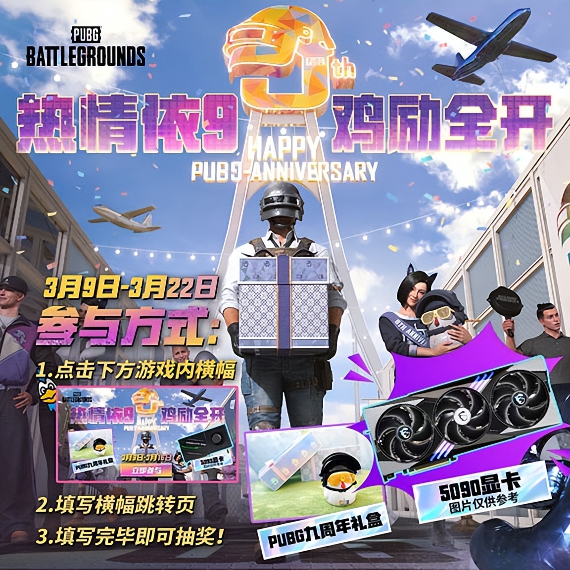 此次9周年活动还为中国玩家特别提供了专属福利兑换码及抽奖活动,更多福利及活动请查看9周年活动页https://pubg9thanniversary.event.playbattlegrounds.com.cn/index.html。