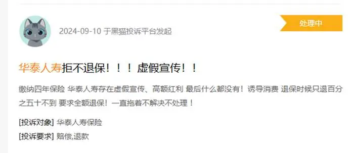 与此同时,黑猫投诉平台上有关华泰人寿的纠纷也越来越多。一位用户投诉说,缴纳四年保险,华泰人寿存在虚假宣传、高额红利,最后什么都没有!诱导消费,退保时候只退百分之五十不到,要求全额退保!这些投诉不断损害着公司的品牌信誉。
