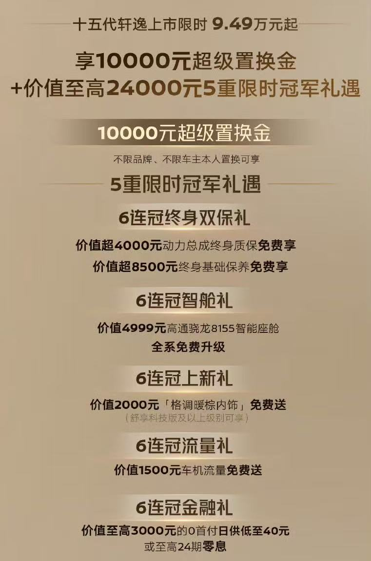 最让人心动的是权益政策。这次东风日产直接给轩逸全系推出了“动力总成终身质保”,十五代车型还有至高2.4万元的限时礼遇,包括置换金、流量包等等。结合9.49万的起售价,可以说是把性价比拉满了。