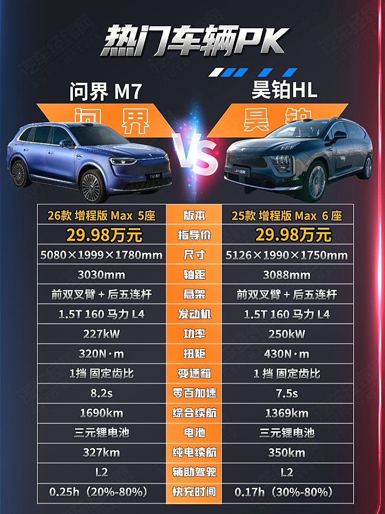 问界M7 2026款增程MAX长续航版5座售价为29.98万元,昊铂HL2025款改款350Max六座激光雷达版售价为29.98万元,两款车价格一致,都定位于高端市场,都以家庭用户为目标,那么哪一款车更值得入手呢?