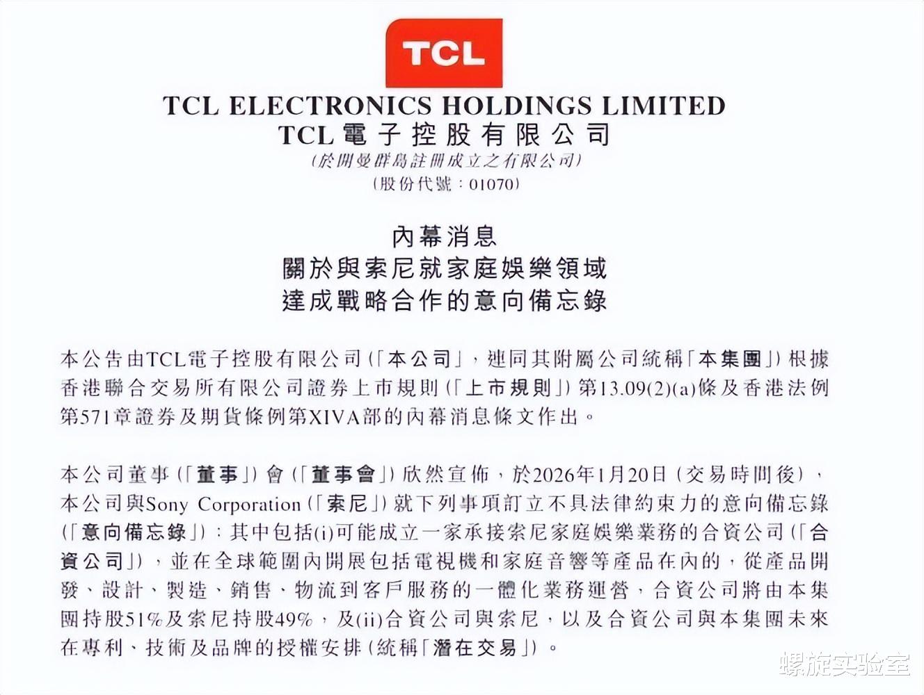 1月20日晚,TCL电子在港交所发布公告,宣布与索尼公司签署意向备忘录,计划成立一家承接索尼家庭娱乐业务的合资公司,由TCL电子持股51%、索尼持股49%。