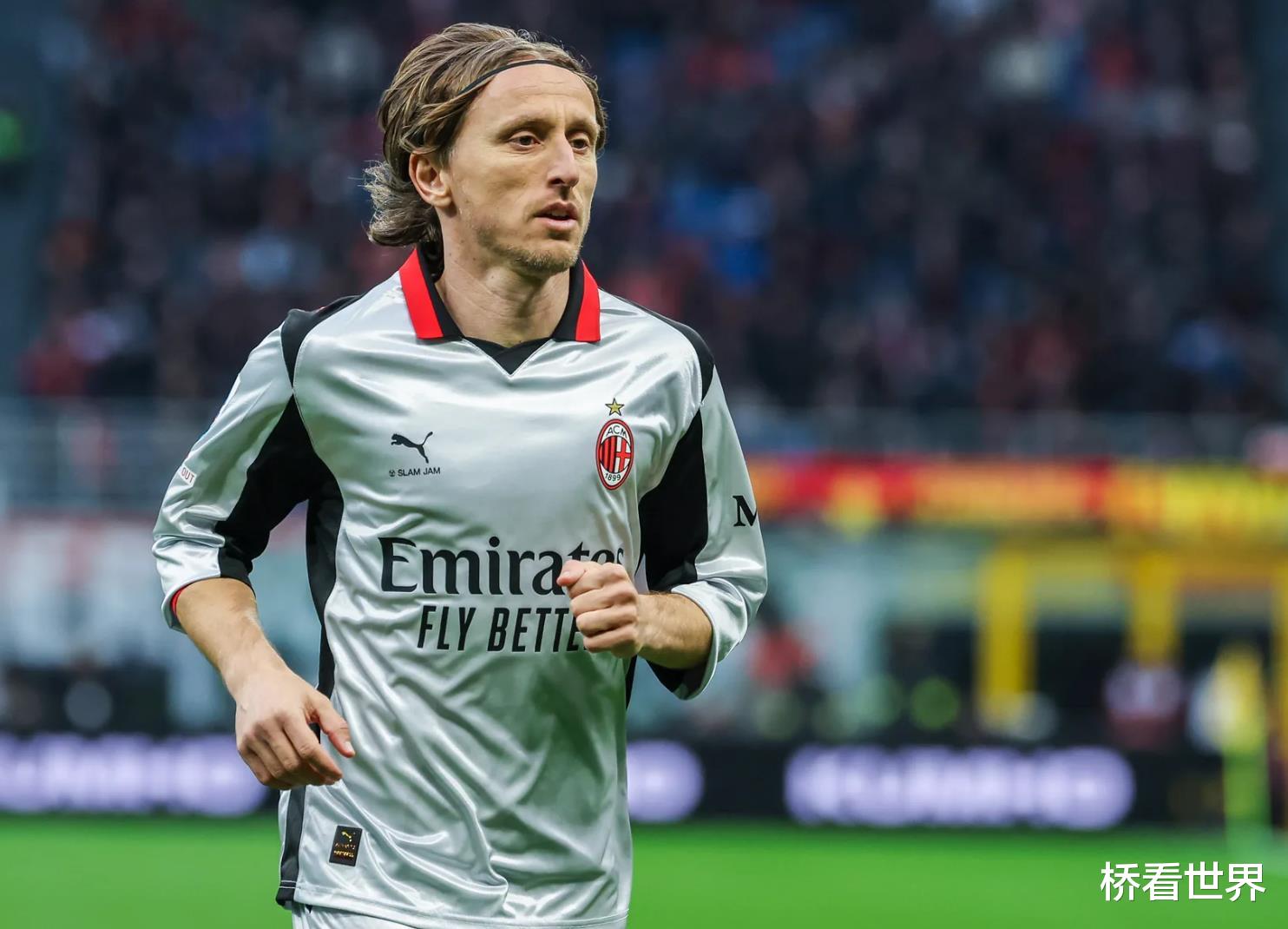 莫德里奇从这位前皇马队友手中接过球衣,满脸笑容。