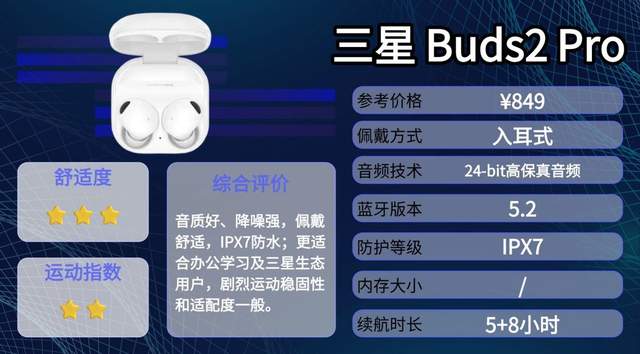 三星Buds2 Pro是三星推出的高保真真无线耳机,支持24bit/48kHz音频和三星自家解码技术,定位在办公、日常使用和影音体验上。对于三星手机或生态用户来说,配对和切换非常便捷,延续了三星产品在设备互联上的优势。
