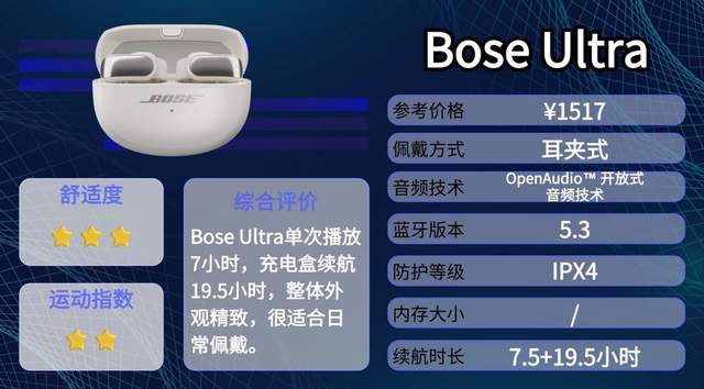 Bose Ultra来自Bose,这个品牌在音频领域老牌可靠,主打舒适和日常听音体验。外观简洁大方,不偏运动风,更适合办公、通勤或轻松日常使用。