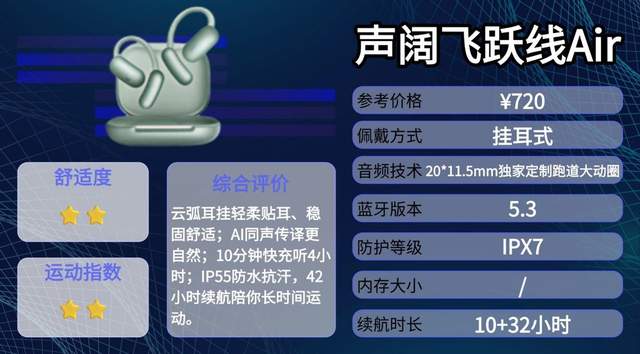 声阔飞跃线Air主打运动与日常使用场景,耳机搭载最新AI翻译引擎,可提供实时语音翻译,适合旅行或跨语言交流。