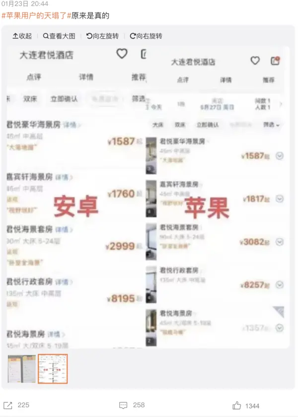 有网友通过对比发现,在部分App上购买机票或打车时,iPhone显示的价格要高于安卓手机。于是,“苹果税导致定价上涨”的结论被广泛传播。