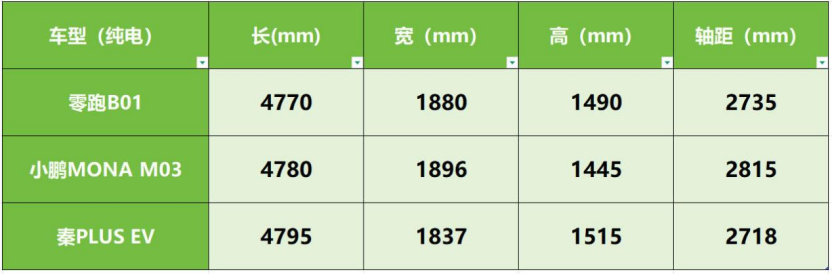 下面我就拿三款现在热度挺高的10万级纯电轿车来比比看:零跑B01、小鹏MONA M03、比亚迪秦PLUS EV。咱们就拿它们各自中间档的续航版本来算。