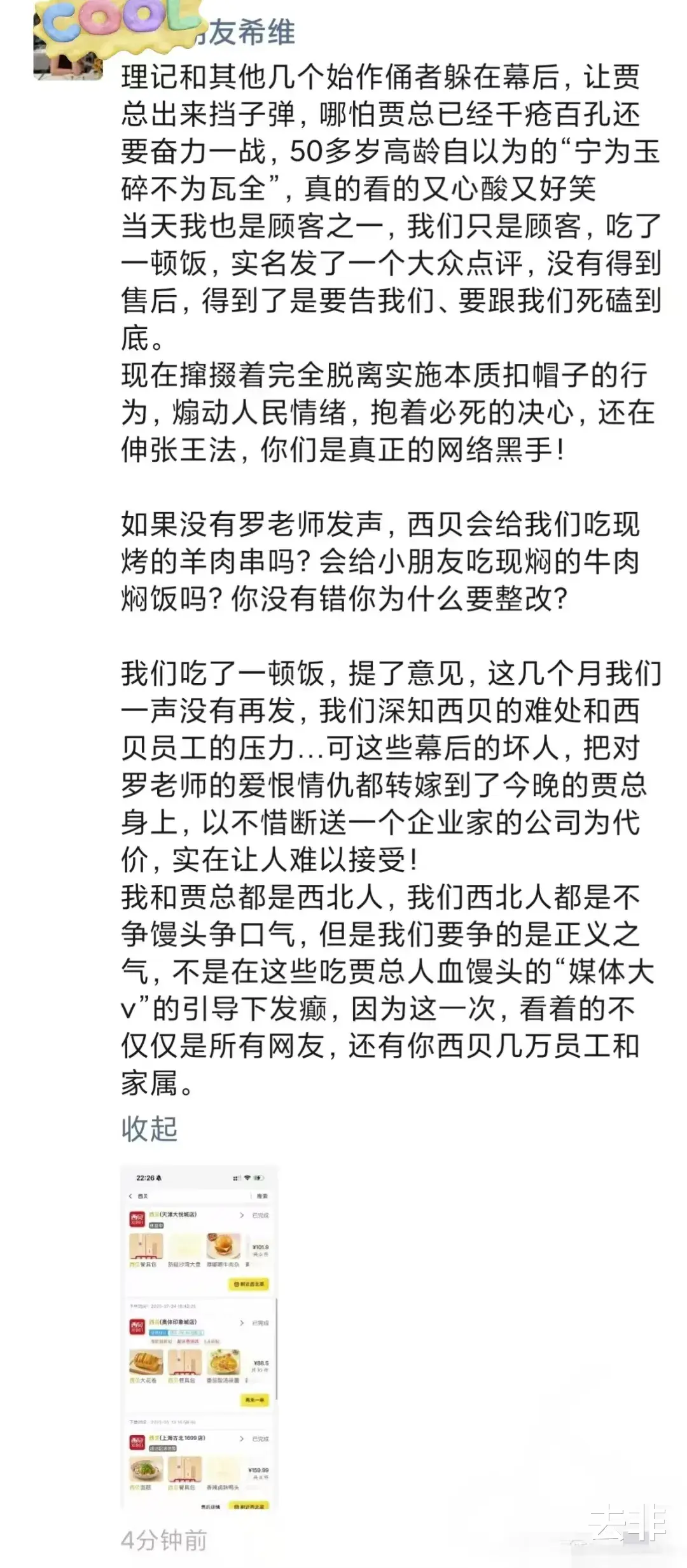 李子旸这人,在网络上挺活跃,他能有什么战斗力?难道就是因罗浩吐槽西贝预制菜时,他站在西贝这边而赢得你贾老板好感吗?可是,也有网友扒出他李子旸此前也曾吐槽你西贝“菜量小到滑稽,是家可笑的饭馆”啊。这咋说?你贾老板这回算是为了复仇大计而不计前嫌吗?