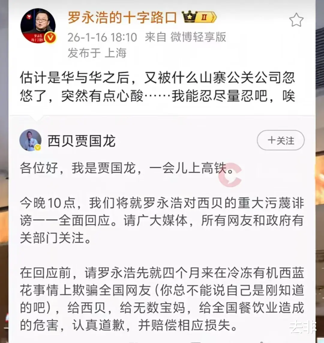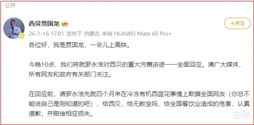 本以为罗永浩与贾国龙的一场狗血闹剧已经翻篇,万万没想到,这两天传出贾老板突然关闭一百多家门店,然后,又突然看到贾老板发帖:他将就罗永浩对西贝的重大污蔑诽谤一一全面回应,请广大媒体网友等关注。贾国龙公开要求罗永浩道歉,并赔偿相关损失。