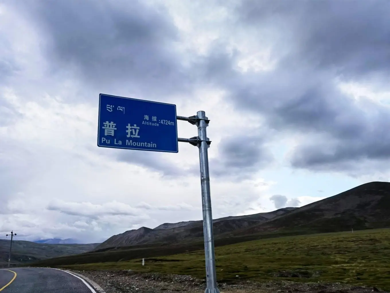 在柏油路上我们可以心情舒畅的毫无忌惮的飞奔,弯曲的道路在高原上飞舞,很快我们就爬到一个垭口,这里是 普拉 ,四周不知道哪一座山峰是最高点,不过海拔4724的标志不知道是指的公路的高程还是周边山峰的高程。