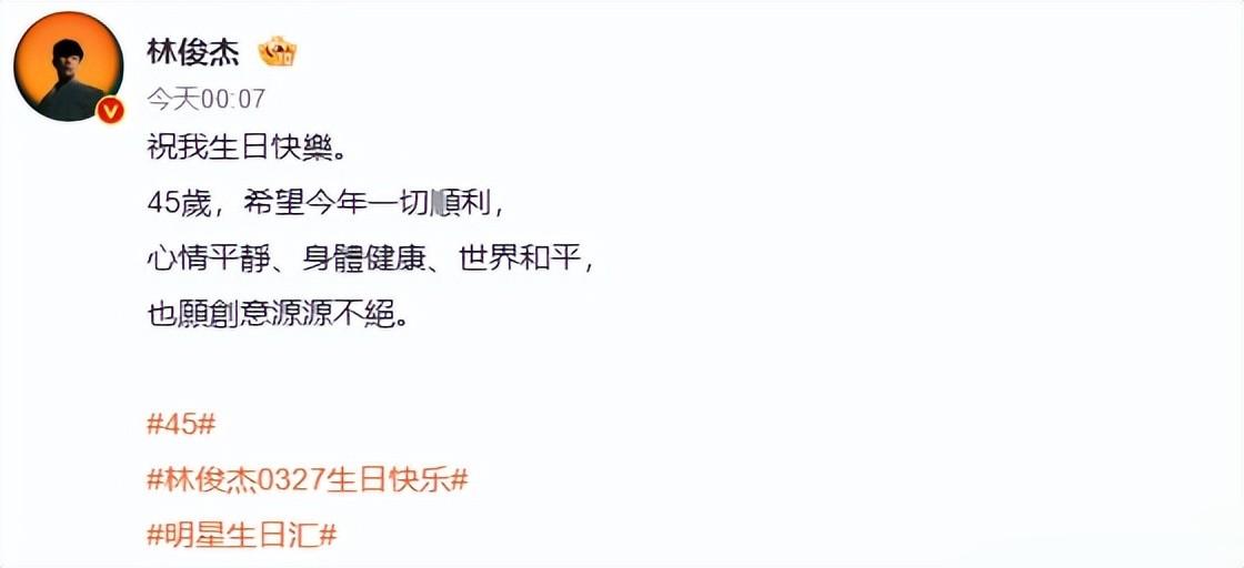 今日凌晨时分,这位传奇歌手在社交平台上面发布祝了自己45岁生日快乐的文案,他就是林俊杰。