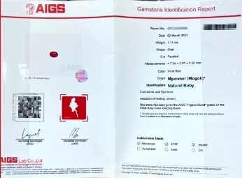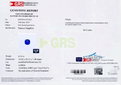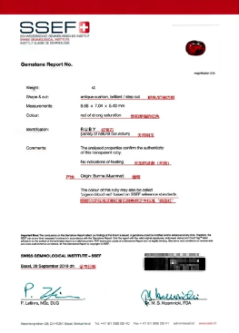 目前珠宝市场里常见的彩色宝石证书,主要来自瑞士宝石研究鉴定所(GRS)、瑞士宝石学院附属研究所(SSEF)、瑞士古柏林宝石实验室(GUBELIN)、亚洲宝石学院(AIGS)以及吉尔德宝石实验室(GUILD),各机构出具的鉴定证书包含的内容大致相近,主要有样品照片、证书编号(Report Number/Report No./No.)、出证日期(Date)等基础信息,还有检测对象(0bject/Item)、鉴定结果 (Identification/Variety)、矿物种属(Species)、样品重量 (Weight)、尺寸(Dimensions/Measurements)、形状(Shape)、切工(Cut)、颜色(Color)、备注(Comment)、产地(0rigin) 等详细信息。除此之外,各机构的鉴定证书还会提供认证签名、全息防伪图、查询条码等防伪标识。