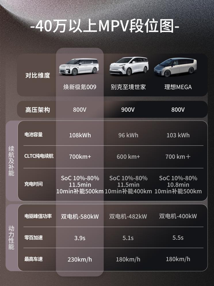 如今国产旗舰 MPV 早已卷到三电硬实力层面,功率、充电、续航每一项都是真金白银的技术底子,双电机四驱基本成了标配,但从这张三电排行榜就能看出差距悬殊:同样是双电机,现款极氪 009 做到了 580kW 的电驱峰值功率,而小鹏 X9 仅 370kW、别克至境世家也只有 482kW;充电效率上,现款 00910 分钟补能 500km,竞品大多止步 400-450km,这份硬核表现让它坐稳三电标杆。新能源车型技术日新月异,升级本是家常便饭,但最怕为拼参数堆配置,而现款极氪 009 本就稳居同级产品力第一,此次焕新自然不是为了追参数,而是把高端用户的真实出行需求做到极致。