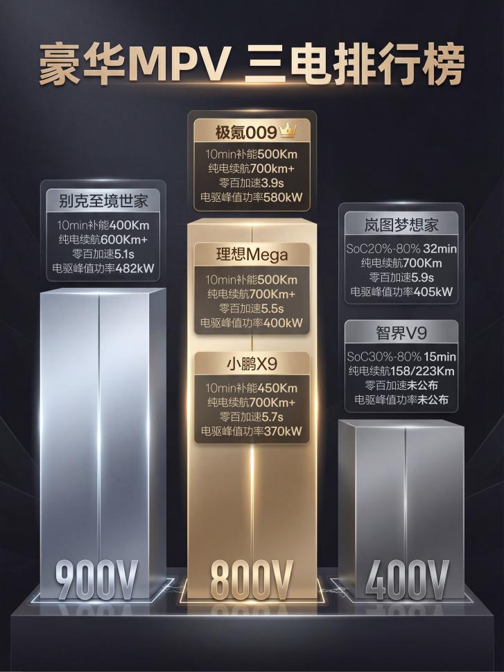 现款 009 作为新能源时代首个 800V 的 MPV,早已凭同级最强性能站稳脚跟,900V 高压架构的引入,并非对 800V的否定,而是在其基础上做优化,进一步降低能耗、提升续航达成率,让长途商务出行或家庭出游的补能更省心。