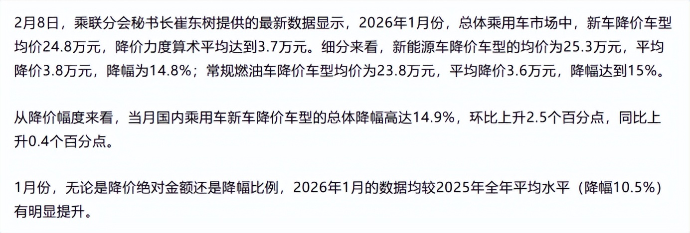 根据乘联会公布的数据,2026年1月国内乘用车市场迎来一轮明显降价潮,新车平均降幅接近15%,单车平均下调超过3万元。更有意思的是,这一轮油电同降,连豪华品牌都开始带头降价。为什么这两年的汽车比前几年便宜了这么多?车价变便宜,一定是结构发生了变化。