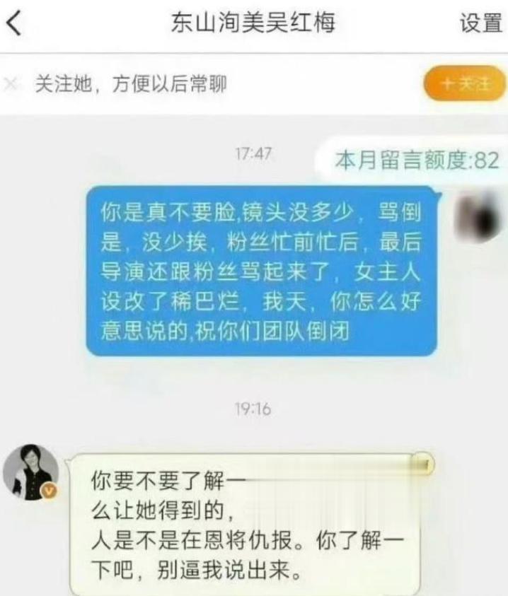 粉丝去找制片人吴红梅讨说法,没想到对方不仅怒怼粉丝,还在私信里说“你要不要了解下这个角色她是怎么得到的?别逼我说出来”。