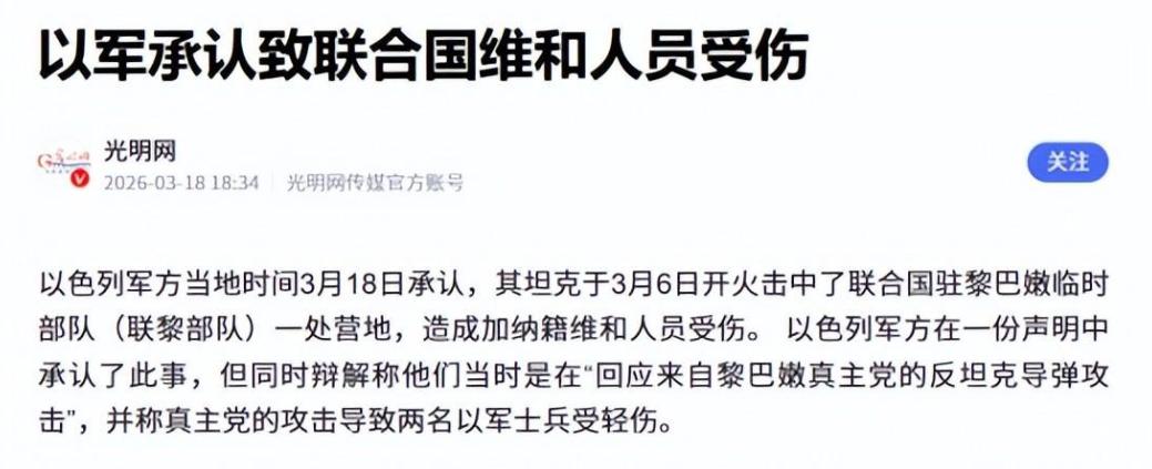 以色列坦克击中维和营地以军承认,早在3月6日,以军的坦克开火击中了联合国驻黎巴嫩临时部队的一处营地,造成两名加纳籍维和士兵重伤,营地设施也被严重破坏。