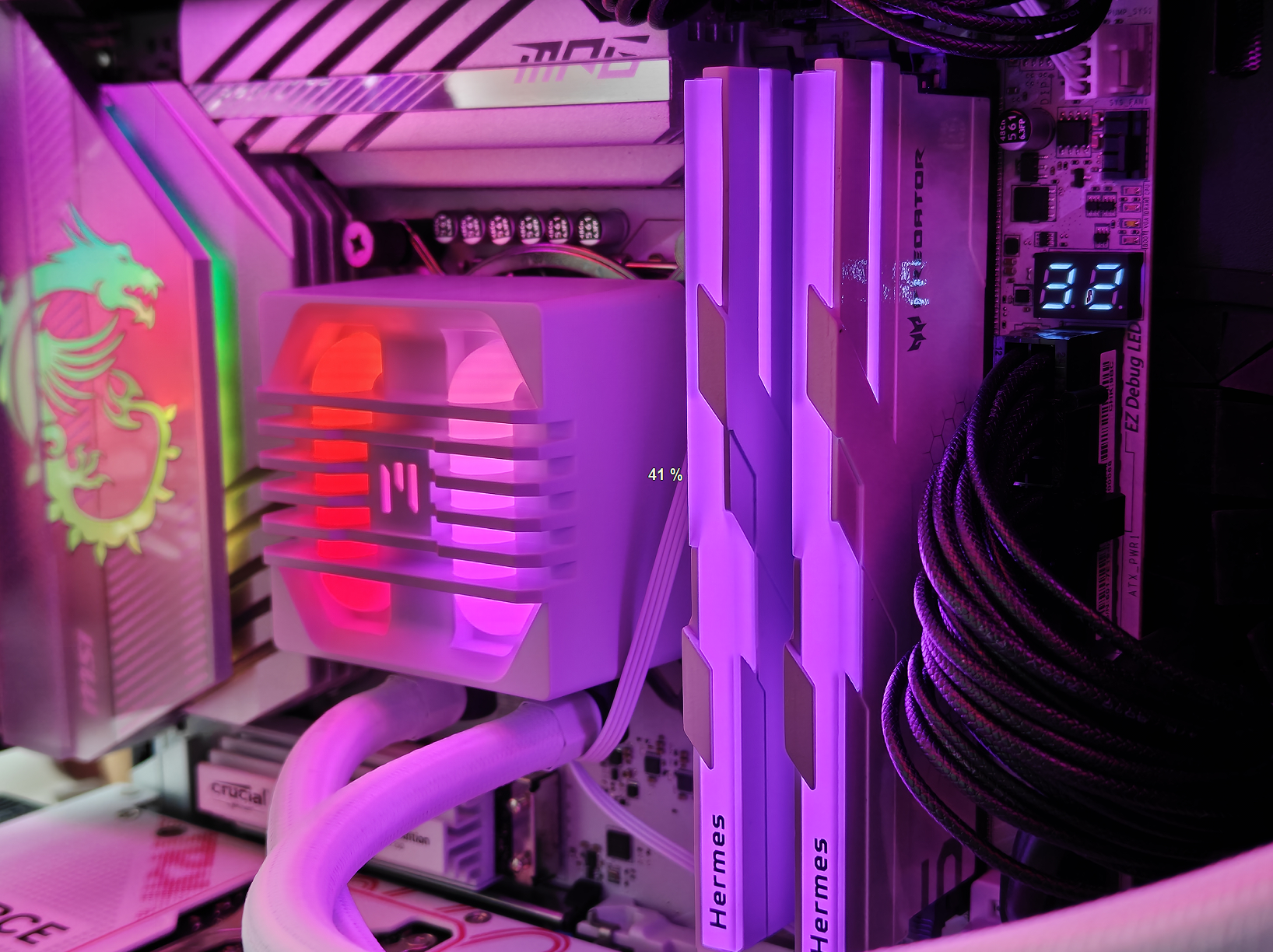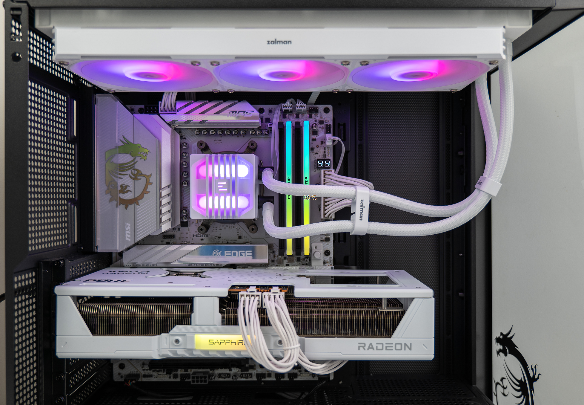 外观方面,这款散热器堪称“白色主题装机神器”。冷排采用全白涂层设计,表面处理细腻,没有明显的毛刺感,搭配同色系的水冷管,整体视觉统一性极强。水冷管采用编织网包裹,不仅提升了美观度,还能有效保护水管,避免使用过程中出现磨损。水冷头设计颇具特色,正面印有ZALMAN的品牌LOGO,支持RGB灯光效果,灯光颜色均匀柔和,可通过主板同步软件实现多种灯光模式切换,无论是静态展示还是动态流转,都能为机箱内部增添十足的氛围感。