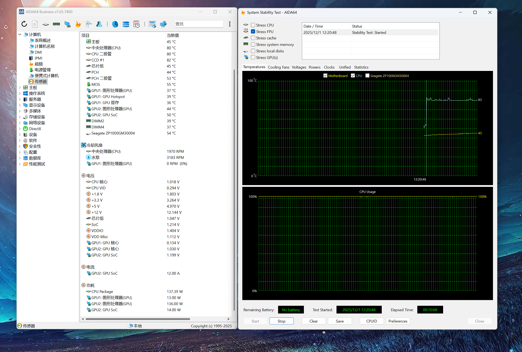 我们使用AIDA64软件对CPU进行单烤FPU测试,持续时间为30分钟,观察CPU核心温度变化。测试开始后,CPU温度迅速上升,10分钟后温度趋于稳定。最终i7-13700K的核心最高温度为80℃,平均温度为78℃,CPU功耗稳定在253W左右。在高负载场景下,散热风扇转速自动提升至1800RPM,水泵转速也随之提高,但整体温度控制表现出色,没有出现过热降频的情况。
