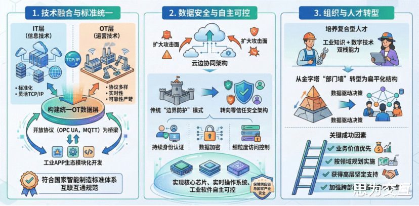 技术变革最终依赖于组织与人。企业需要培养具备“工业知识+数字技术”双栈能力的复合型人才。同时,数字化转型要求组织结构向扁平化、数据驱动决策转变,必须打破部门墙。成功的转型实践表明,优先考虑业务价值、按领域规划实施、获得高层坚定支持并加强跨部门沟通与变革管理,是关键的成功因素。
