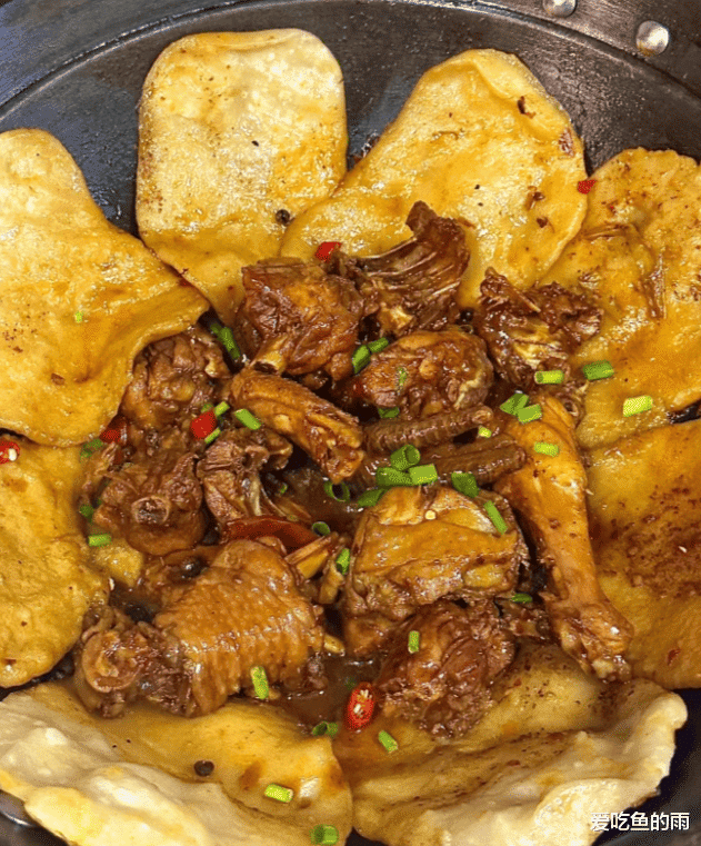 揭开锅盖那一刻,香气直冲天灵盖!鸡肉红亮油润,土豆或香菇若隐若现,锅边的贴饼金黄诱人,边缘微微翘起,轻轻一掰,内里蓬松柔软,蘸点锅底的汤汁,那滋味简直绝了。鸡肉咸香微辣,越炖越入味;贴饼一半酥一半糯,既有主食的踏实,又有汤汁的丰腴,一口饼一口鸡,吃得人满嘴留香、额头冒汗,连话都顾不上说。