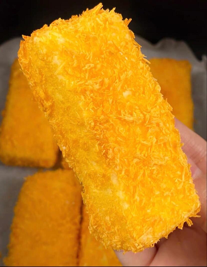 奶糕凝固后,倒扣在案板上,切成你喜欢的形状——长条、方块、甚至爱心都行,只要别太大块,不然炸不熟。我通常切成手指粗细的长条,一口一个刚刚好。