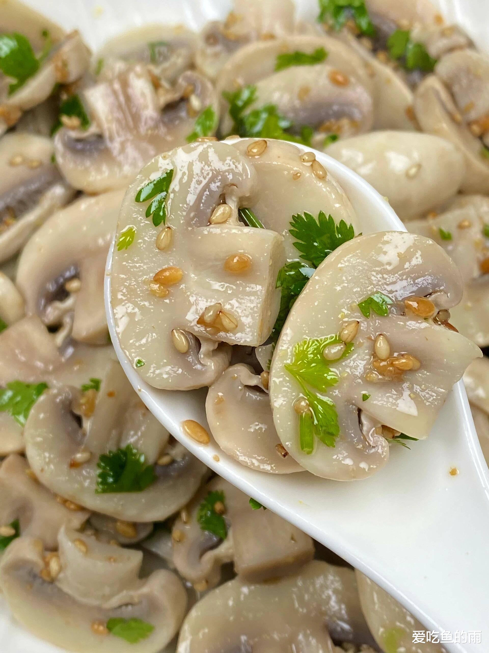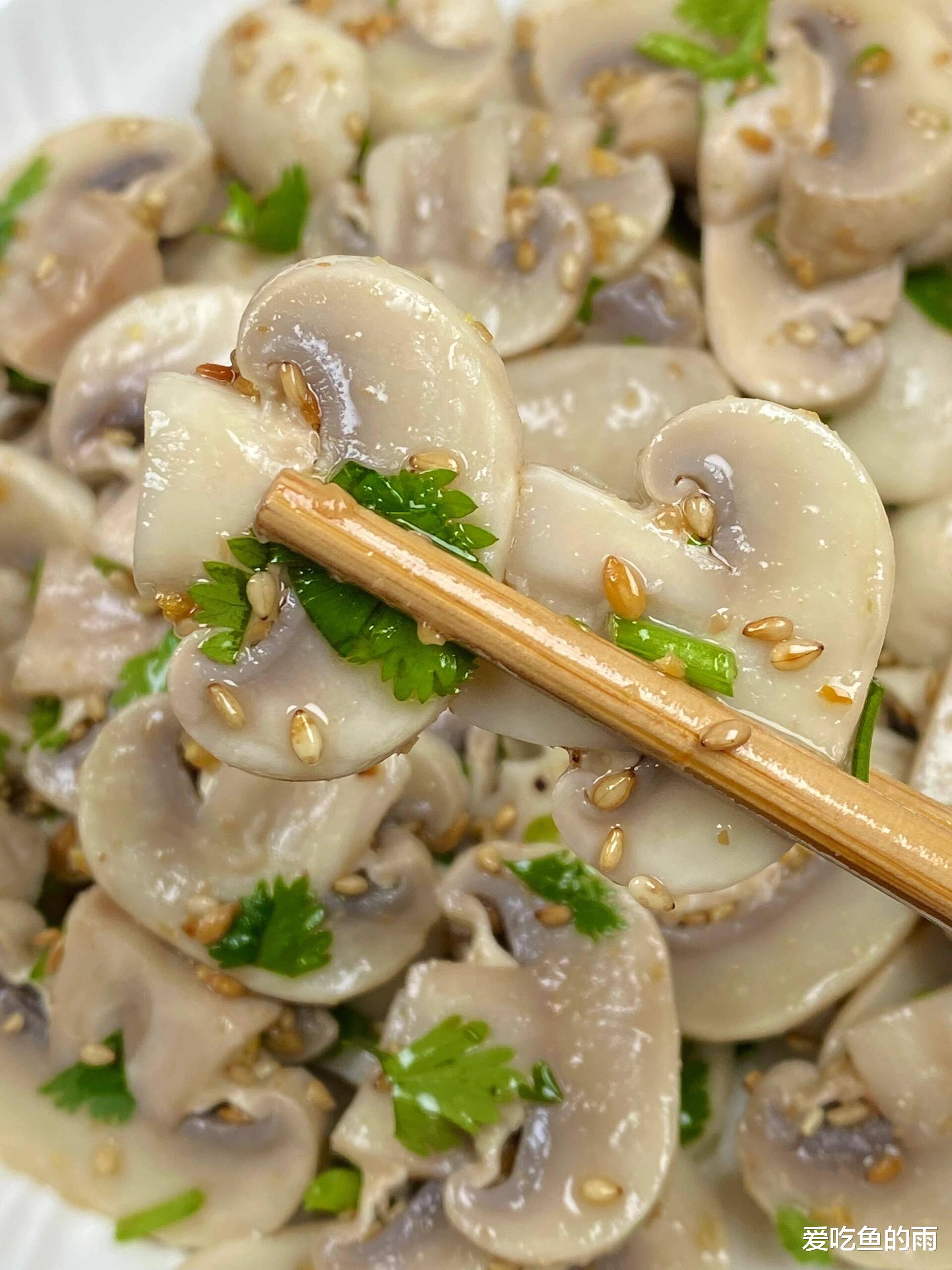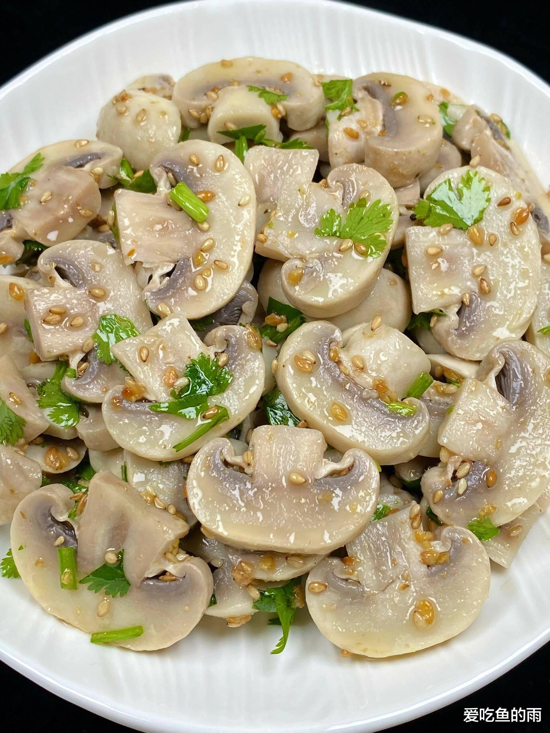 做法简单到连厨房小白都能闭眼操作,但有个小秘诀不能漏。口蘑千万别切太薄,不然一焯水就缩没了,切成硬币厚的片刚好。水烧开加点盐,把口蘑扔进去烫个一两分钟,看着它变软立马捞出来过凉水,这一步是为了让它口感脆嫩像吃肉一样。这时候把香菜切段铺底,口蘑码上去,最关键的一步来了——撒上两大勺自制的芝麻盐!别的什么调料都不用放,什么生抽醋蒜泥统统靠边站,就这三样拌匀了吃。我第一次做的时候还在那纠结要不要滴两滴香油,结果端上桌被我爸一顿吐槽:“瞎折腾!原味才最鲜!”硬着头皮尝了一口,哎呦喂,口蘑的鲜甜撞上香菜的冲劲儿,再裹着芝麻的焦香,在嘴里噼里啪啦地炸开,真的鲜掉眉毛!