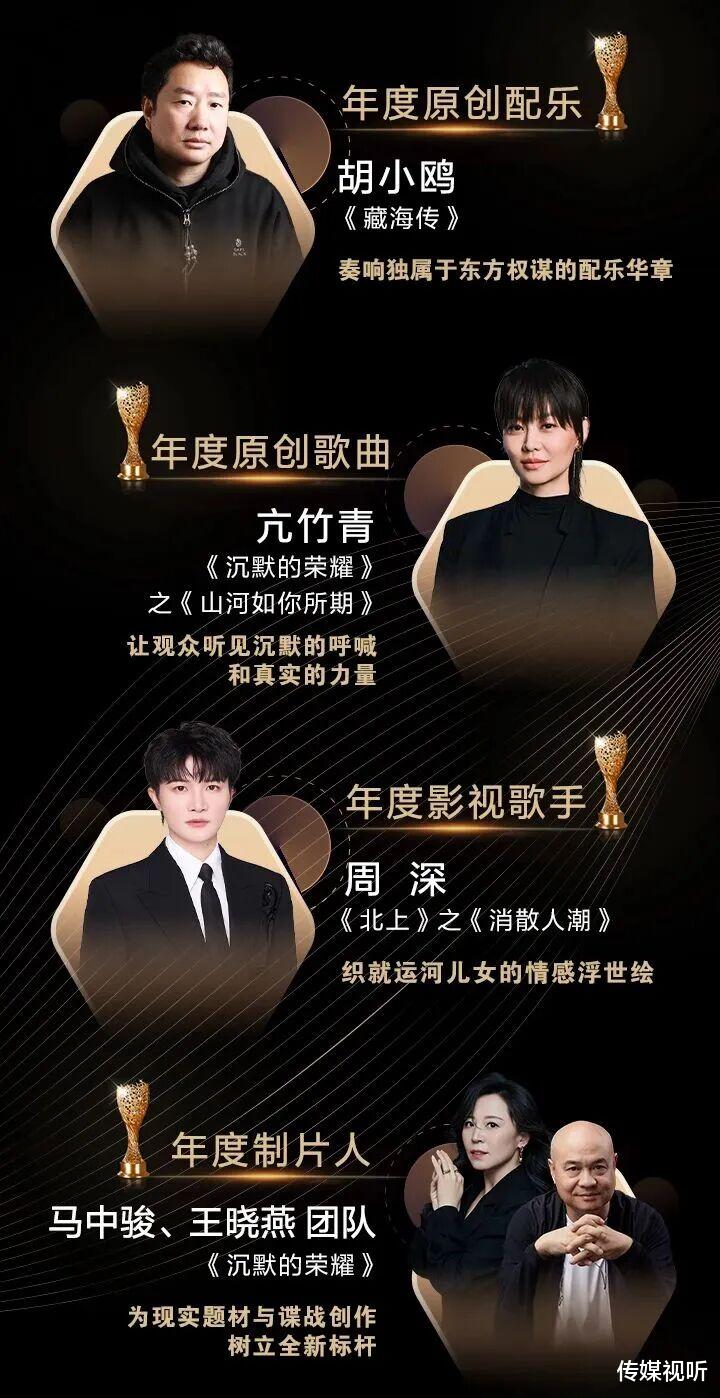 音乐类荣誉同样动人心弦。胡小鸥以《藏海传》的配乐获“年度原创配乐”,亢竹青凭借《沉默的荣耀》插曲《山河如你所期》摘得“年度原创歌曲”。