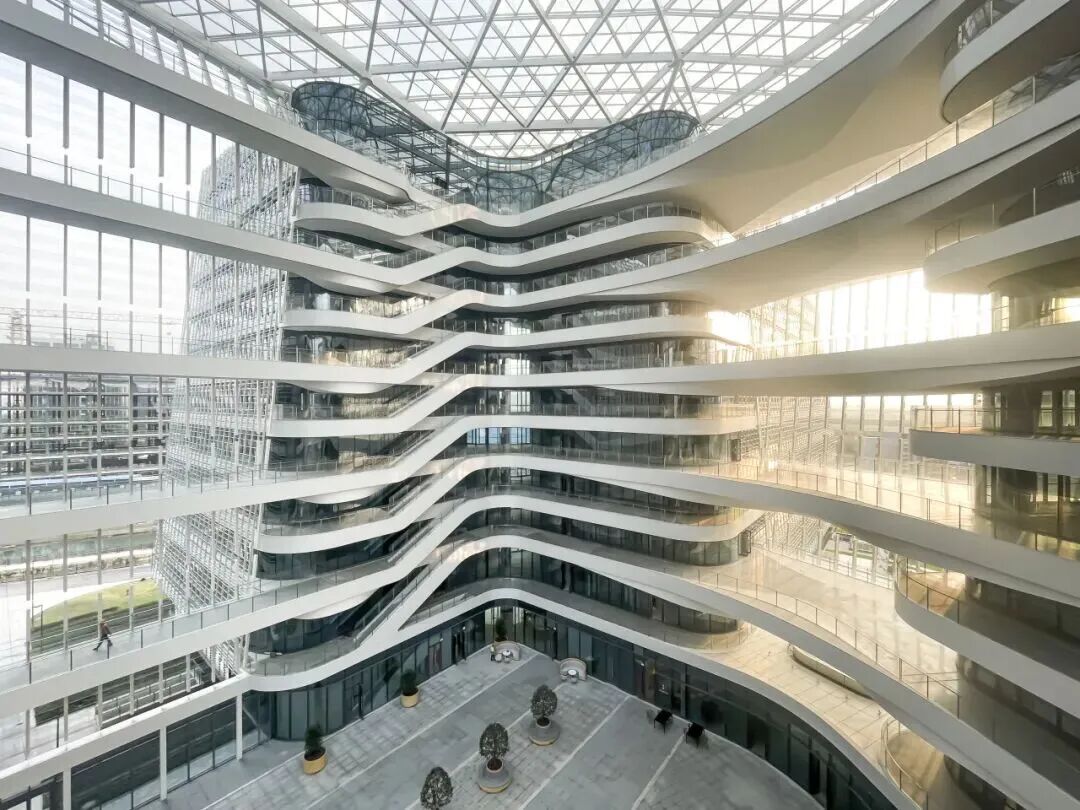 三栋楼中央,一片超过四千平方米的天幕覆盖之下,形成三层挑高的明亮中庭,不仅成为空间核心,也优化了整体的通风与通透感。