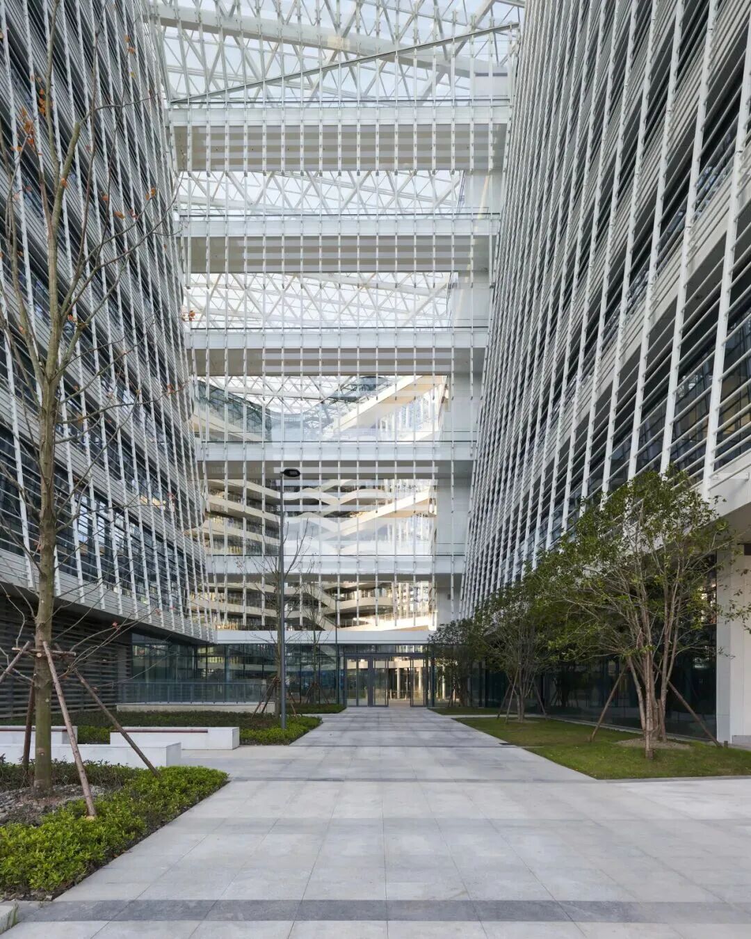 建筑立面的横向格栅化解了西晒与对视困扰,锯齿状的玻璃幕墙则柔化了室内光线,避免直射干扰实验与思考。