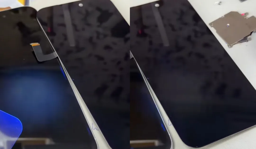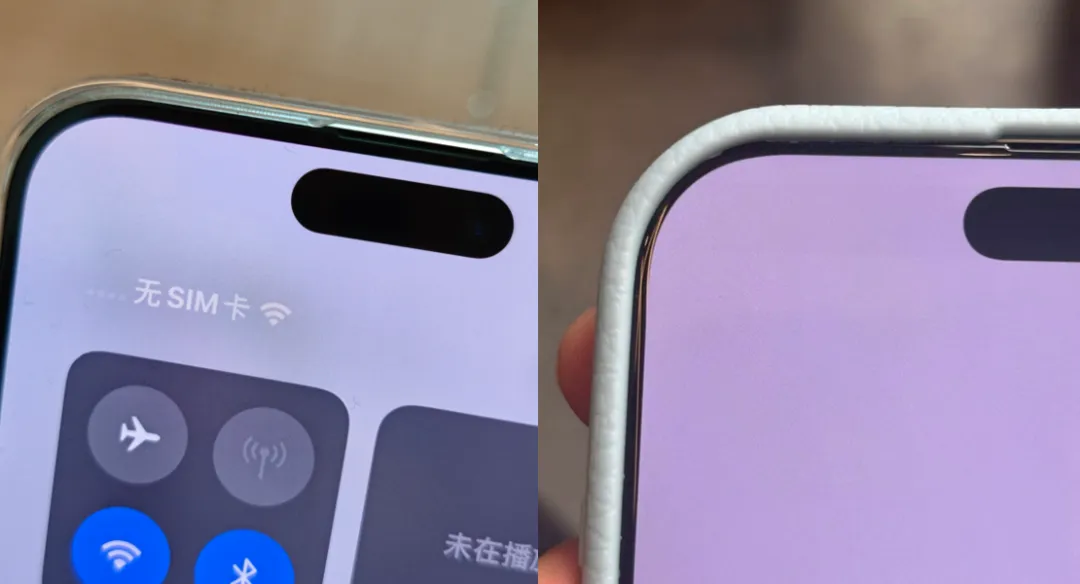 回到最近的热点话题,iPhone 17ProMax的fog屏已经出现,现阶段fog屏的分辨非常简单,直接看“灵动岛这边会不会有一条线”,目前所有的Phone 17ProMax的fog屏都会存在这一情况,此外在紫光等下,原装屏幕会黑一点,fog屏会蓝一点。