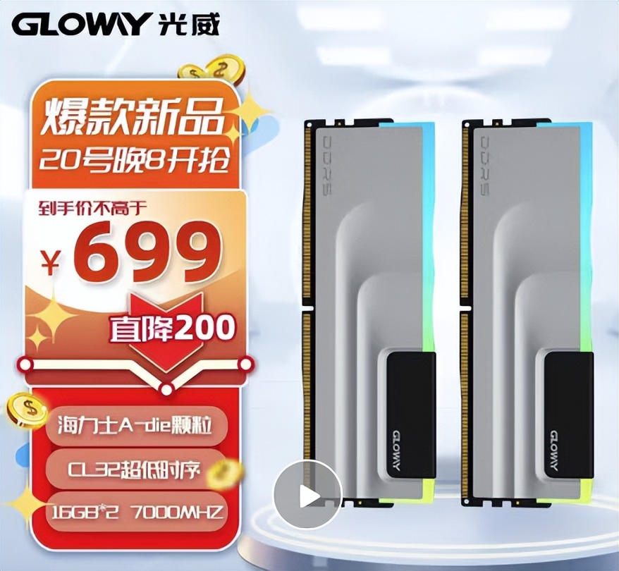 价格方面,5-20晚上八点,光威神武DDR5 7000到手价直降200,仅需699即可入手!