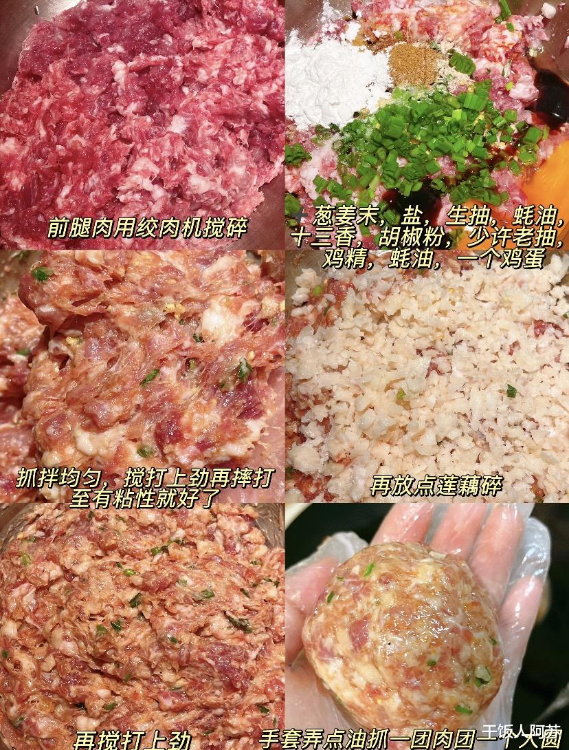 制作红烧狮子头,选肉是第一步。建议选用猪前腿肉,肥瘦比例控制在3:7左右,这样的肉质既有足够的脂肪带来香润口感,又不会过于油腻。将前腿肉去皮后,用绞肉机绞碎,或者用刀手工剁成肉末,手工剁的肉馅更有颗粒感,口感更佳。绞好的肉馅放入大碗中,接下来就是调馅的关键步骤。在肉馅中加入葱姜末、盐、生抽、蚝油、十三香、胡椒粉、少许老抽、鸡精,再打入一个鸡蛋。鸡蛋能增加肉馅的粘性,让丸子更容易成型。如果喜欢更丰富的口感,还可以加入一些切碎的莲藕丁或马蹄丁,增加脆爽的口感。所有调料加入后,用手朝着一个方向搅拌上劲,这个过程需要耐心,直到肉馅变得粘稠、有弹性,能拉出丝状物为止。这一步是肉丸是否Q弹的关键,搅拌时间越长,肉丸越有嚼劲。
