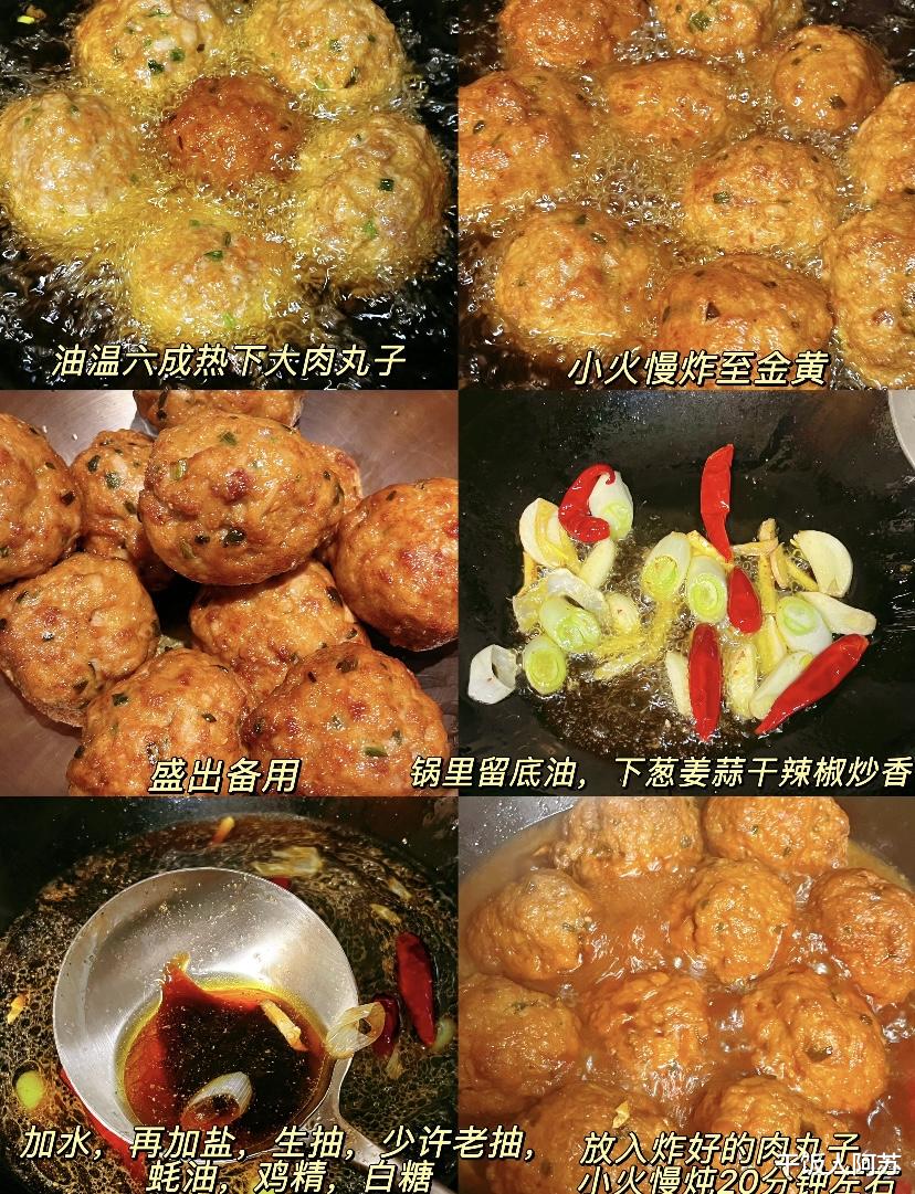 炸好的丸子先盛出来备用。锅里留少许底油,放入葱段、姜片和干辣椒炒香,然后加入适量的清水。水中加入盐、生抽、少许老抽、蚝油和白糖,搅拌均匀。将炸好的丸子放入锅中,大火烧开后,转小火慢炖20分钟左右。慢炖的过程能让丸子充分吸收汤汁的味道,变得更加入味。炖煮时要注意观察汤汁的量,避免烧干。丸子炖好后,先将丸子捞出,放入盘中。接着,将锅中的葱姜蒜等料头捞出,开小火,倒入水淀粉勾芡。水淀粉要分次加入,边加边搅拌,直到汤汁变得浓稠,能挂在勺子上为止。最后,将熬好的浓稠酱汁均匀地浇在丸子上,撒上葱花点缀,一道色香味俱全的红烧狮子头就完成了。